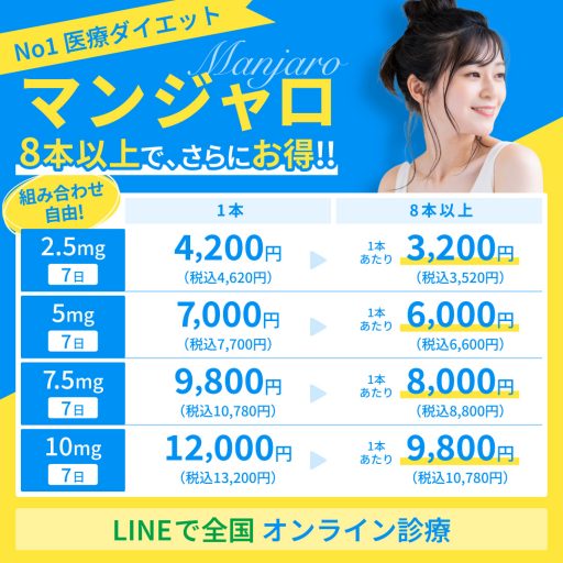 施術の価格:30日分 28,600円~74,800円マンジャロは2型糖尿病の治療薬として厚生労働省に承認されていますが、肥満治療目的での処方については国内では承認されておらず、保険適応外の自由診療となります。アメリカのFDAにおいては、一般名チルパゼチドとして肥満治療薬として承認されており安全性が認められております。マンジャロは、国内医薬品販売代理店経由で購入しております。